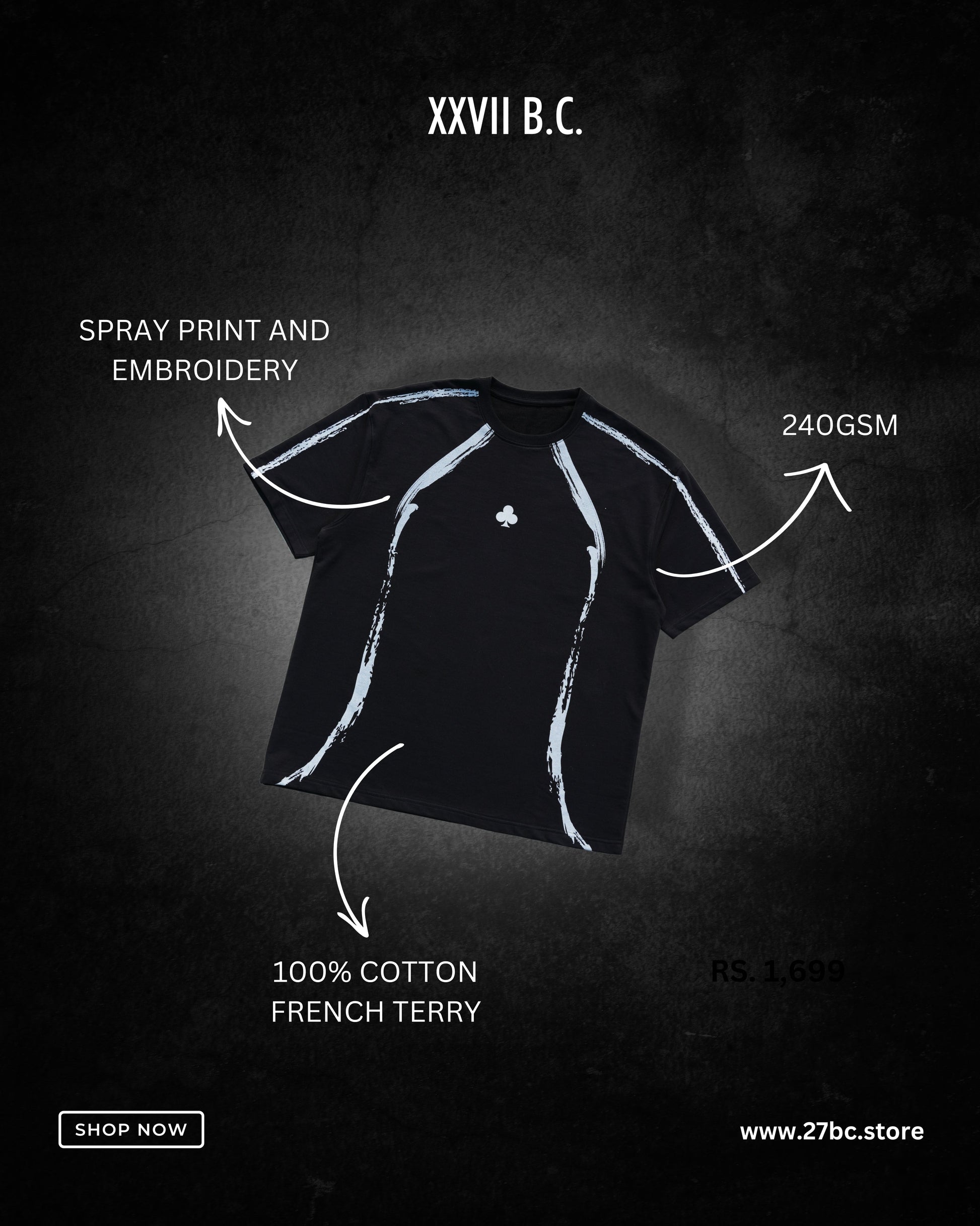 Stand Out with the Oversized Tee from 27 B.C. Discover the perfect blend of comfort and style with our Oversized Tee from 27 B.C. Crafted from premium, breathable supima cotton, this tee is designed to offer a relaxed fit while ensuring you stay ahead in the fashion game. The oversized silhouette adds a modern twist to a classic staple, making it a must-have for any wardrobe. Style Tip: Embrace the laid-back vibe by pairing this oversized tee with distressed jeans or cargo pants. For a more refined streetwear look, layer it with a sleek bomber jacket or an edgy flannel shirt. Whether you're hitting the streets or lounging at home, this tee guarantees you’ll look effortlessly cool and stylish. 100% COTTON FRENCH TERRY240GSMSPRAY PRINT AND EMBROIDERY